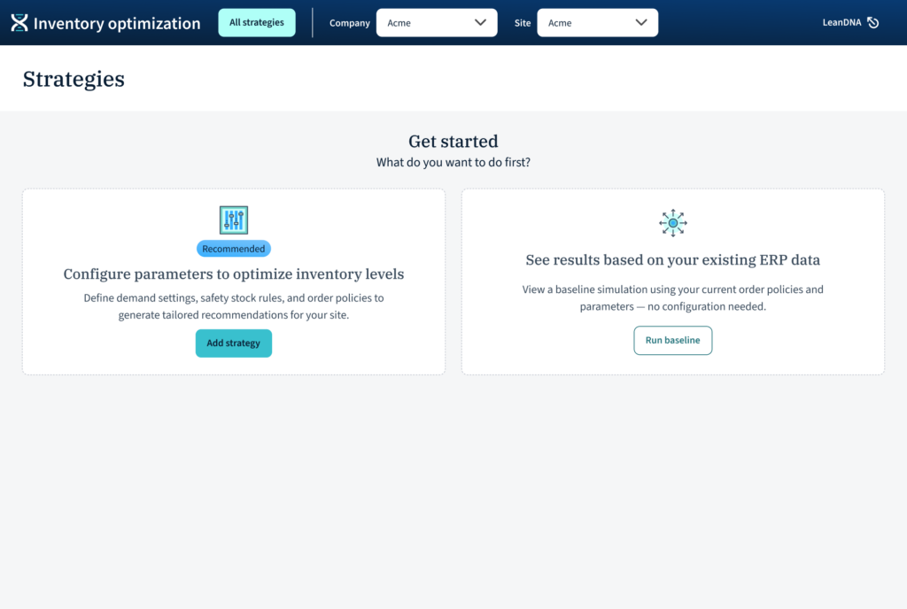 A real landing page: “All strategies.” Every scenario that has been run has a place and a “spot,” whether as a card, a point on the scatter plot, or table row. A zero state walks new users into a recommended path or a lower-commitment “Run baseline” against existing ERP data. We also renamed “simulations” to “scenarios.”