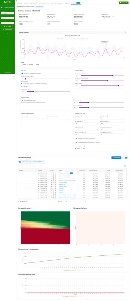 Add/edit as a dedicated flow. Adding a scenario now lives in its own tabbed flow (Global, Demand analytics, Safety stock, Order policy, Overrides, Simulation parameters) with a persistent “Run analysis” button. The user is unambiguously in editing mode here, including an auto “Saved to strategies” message. Once the scenario is run, users return to the landing page with a clear running state on the card, rather than stranding them on an edit screen that silently goes stale.